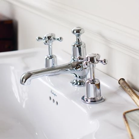 The Claremont 3 tap hole basin tap with pop up waste from Burlington, features a classic traditional design and manufactured to the highest standards using the latest technology. Create the perfect period bathroom with our range of quality chrome plated traditional taps. Comes with a 10 year guarantee.