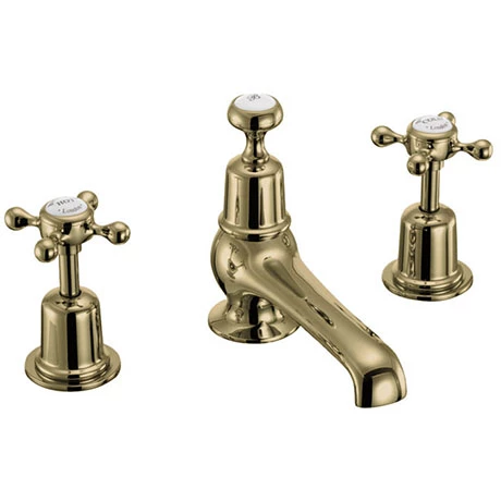 This Burlington Claremont 3 tap hole basin mixer in a stunning Gold finish adds a sense of opulence and grandeur to your bathroom. The tap features quarter turn valves and comes supplied with a pop-up waste. All Burlington taps come supplied with two Neoperl devices: A flow straightener, which is for use with low water pressures and an aerator, which is for use with high water pressures.
