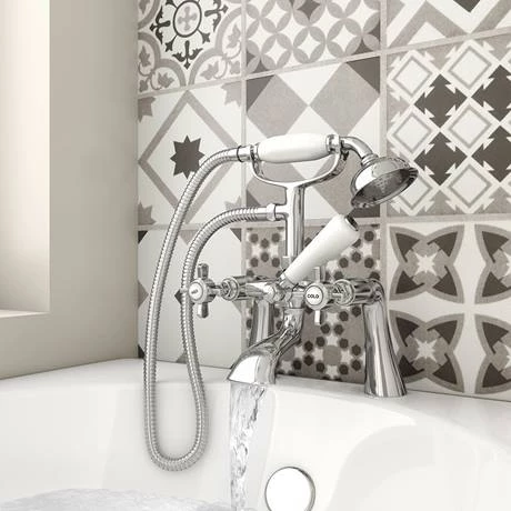 These Regent Traditional Bath Shower Mixer Taps are inspired by Victorian and Edwardian designs for a traditional feel. While they have an antique look, they’re manufactured to today’s high standards, with brass bodies and ceramic handles for durability. This chrome mixer tap is 320mm tall, with a polished plated finish that gives a contemporary sparkle. It’s easy to install and can quickly divert water to a handheld hose for flexible use. Whether you’re looking to replace a worn out tap or redesign the whole room, this bath mixer tap looks at home on a single ended bath.
